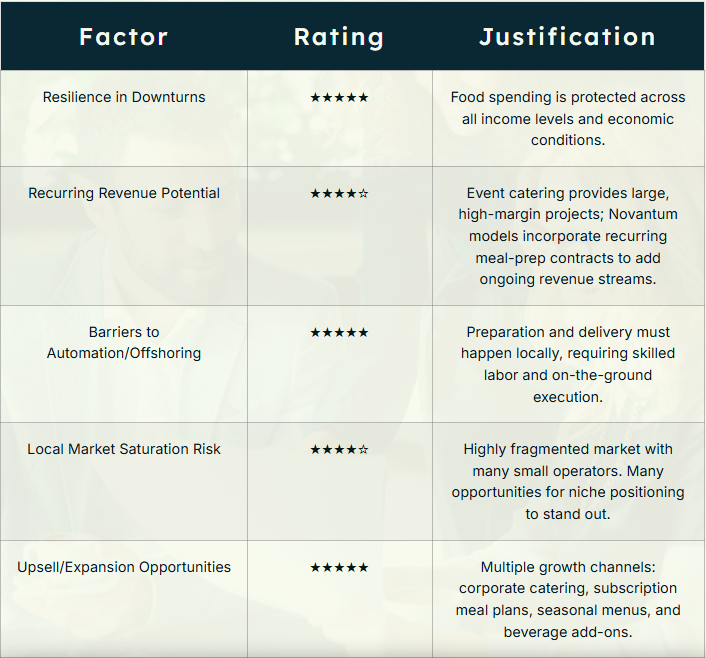 | Recurring Revenue Potential | ★★★★☆ | Event catering provides large, high-margin projects; Novantum models incorporate recurring meal-prep contracts to add ongoing revenue streams. |